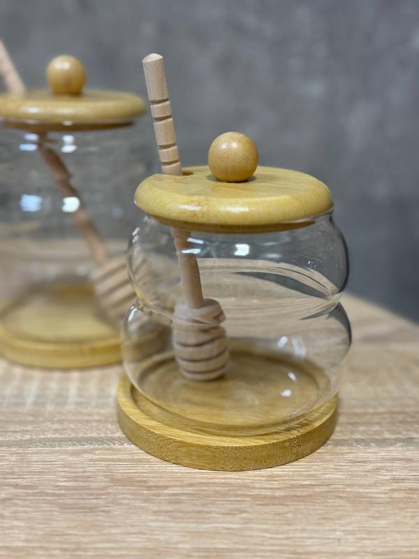 Банка для меду yiwu 64486-8 медовниця скляна з кришкою на бамбуковій підставці 350 мл проз...