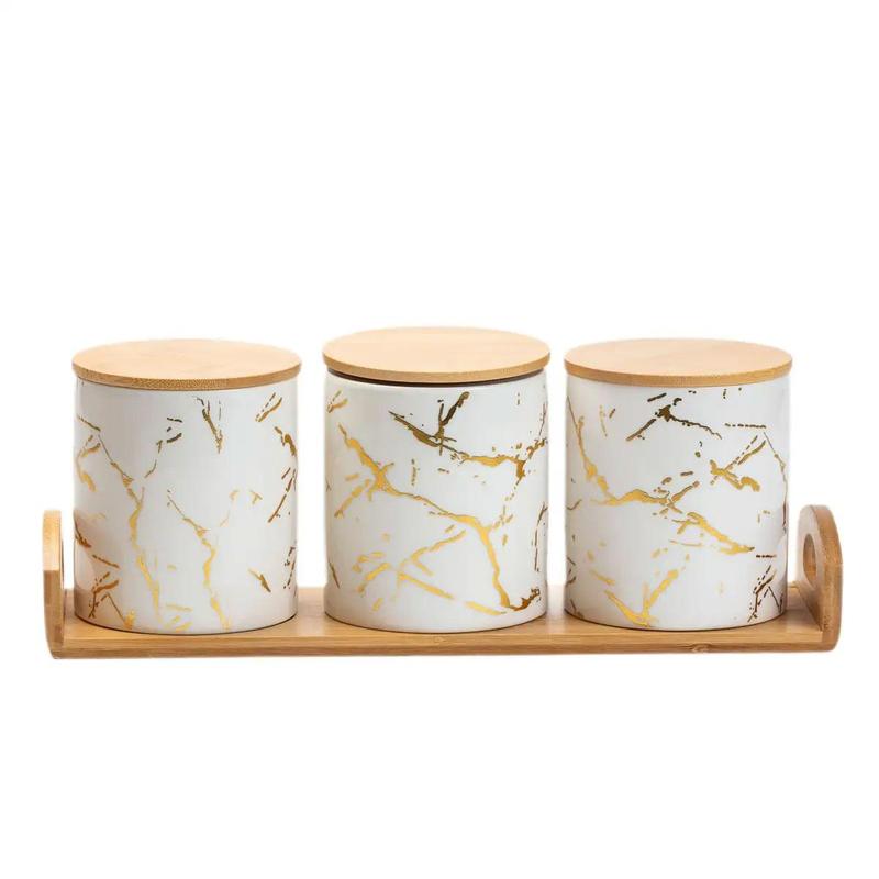 Элегантный набор банок для сыпучих продуктов на подставке станет стильным и практичным дополнением вашей кухни. Набор включает три керамические банки, каждая из которых оснащена бамбуковой крышкой, что обеспечивает надежное хранение содержимого. Бамбуковая подставка не только повышает эстетическую привлекательность набора, но и организует пространство, обеспечивая удобное размещение банок. Характеристики: Материал банок: Керамика Материал подставки: Бамбук Объем баночек для специй: 0.65 л Преимущества: Керамические банки: Изготовлены из высококачественной керамики, которая гарантирует долговечность и сохранение вкуса и аромата сыпучих продуктов. Банки имеют элегантный вид и легко очищаются. Бамбуковые крышки: Плотно закрываются, защищая содержимое от влаги и посторонних запахов. Они обеспечивают герметичность и продлевают срок хранения продуктов. Бамбуковая подставка: Добавляет естественной эстетики и организованности. Подставка помогает хранить банки в порядке и легко доступными, оптимизируя кухонное пространство. Легкий уход: Все элементы набора можно мыть в посудомоечной машине, что делает уход за ними простым и удобным. Этот набор сочетает в себе функциональность, естественную красоту и удобство, что делает его идеальным выбором для любой современной кухни.