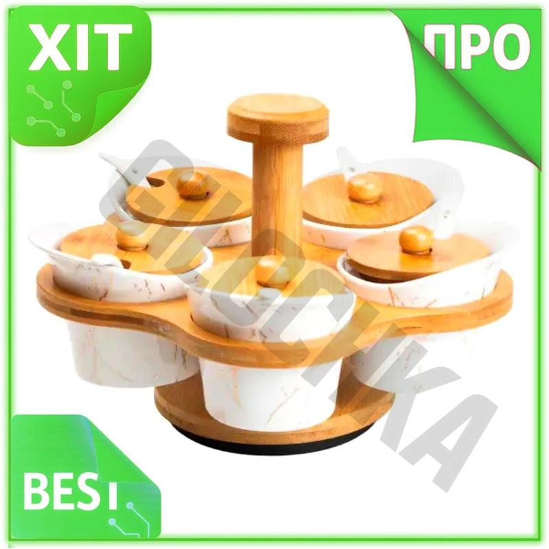 ## VE Набір для сипучих продуктів New Version 5 банок 120 мл з бамбуковою білою підставкою для спецій цук N6W_VER Набір баночок для сипучих продуктів складається з п'яти банок по 120 мл, виконаних у білому кольорі під мармур. Ці елегантні баночки створені для зручного та стильного зберігання різноманітних сипучих продуктів, таких як спеції, цукор, сіль чи чай. Кожна банка оснащена бамбуковою кришкою, яка забезпечує надійне закриття і зберігає продукти свіжими, а також керамічною ложечкою, що додає зручності у використанні та точного дозування. Особливістю цього набору є бамбукова підставка, що обертається, вона забезпечує легкий доступ до будь-якої з баночок. Підставка не лише надає набору стійкості, але й економить простір на кухні, роблячи зберігання організованим і стильним. Використання бамбука додає природного вигляду та екологічності, гармонійно поєднуючись з мармуровим дизайном банок. Цей набір баночок для сипучих продуктів є не тільки практичним, але й декоративним елементом для вашої кухні. Завдяки своєму стильному дизайну та високоякісним матеріалам, він стане чудовим доповненням до будь-якого кухонного інтер'єру, підкреслюючи ваш смак та увагу до деталей. Баночки легко миються та довговічні у використанні, що робить їх ідеальним вибором для кожного дому. Характеристики: - Матеріал банок: Кераміка - Матеріал підставки: Бамбук - Об'єм однієї банки: 120 мл Назва Од.Вим. Значення ТипНабір для сипучих МатеріалКераміка Вага1.440 кг Декоративне оформленняРозпис Кількість ємностей5 Матеріал підставкиБамбук Матеріал кришкиБамбук ЛожечкаКераміка Об`єм120 мл Колір.Білий Підходить для миття в посудомийній машиніНі Гарантия14 днів Не пропустіть вигоду! Кількість акційних товарів суворо обмежена! Попередження: на ринку працюють м'яко кажечи не сильно чесні люди, пропонуючи дешеву низькоякісну продукцію під виглядом справжнього товару!Будьте пильними. Ми гарантуємо вам придбання виключно добротного товару в Україні, який бездоганно виконує свої функції та приносить лише позитивні емоції від використання. Чому вигідно купувати саме у нас? Справжні відгуки та рекомендації від задоволених клієнтів Наш інтернет-магазин по праву гордиться великою кількістю позитивних відгуків від вдячних клієнтів. Ознайомтесь з їхніми думками та порадами прямо на цій сторінці або на нашому офіційному сайті, щоб остаточно переконатися у правильності вашого рішення. Максимальна відкритість і чесність у кожному аспекті Ми будуємо міцні відносини з покупцями на засадах порядності та відкритості, завжди готові до діалогу та пошуку компромісів. Всі ключові характеристики продукції, гарантійні зобов'язання та умови обміну детально представлені на нашому веб-сайті, що забезпечує повну довіру та взаєморозуміння. Проста та зручна процедура повернення без зайвих зусиль Ми прекрасно розуміємо, що іноді трапляється, що обраний товар з якихось причин не підійшов. Саме тому наша система повернення є максимально прозорою та клієнтоорієнтованою, щоб ви відчували себе захищено та спокійно після здійснення покупки. Обслуговування преміум-класу, підкріплене 10-річним досвідом Наші досвідчені фахівці завжди готові надати вичерпну консультацію та професійну допомогу у виборі оптимального товару. Ми цінуємо кожного покупця та докладаємо максимум зусиль, щоб процес в