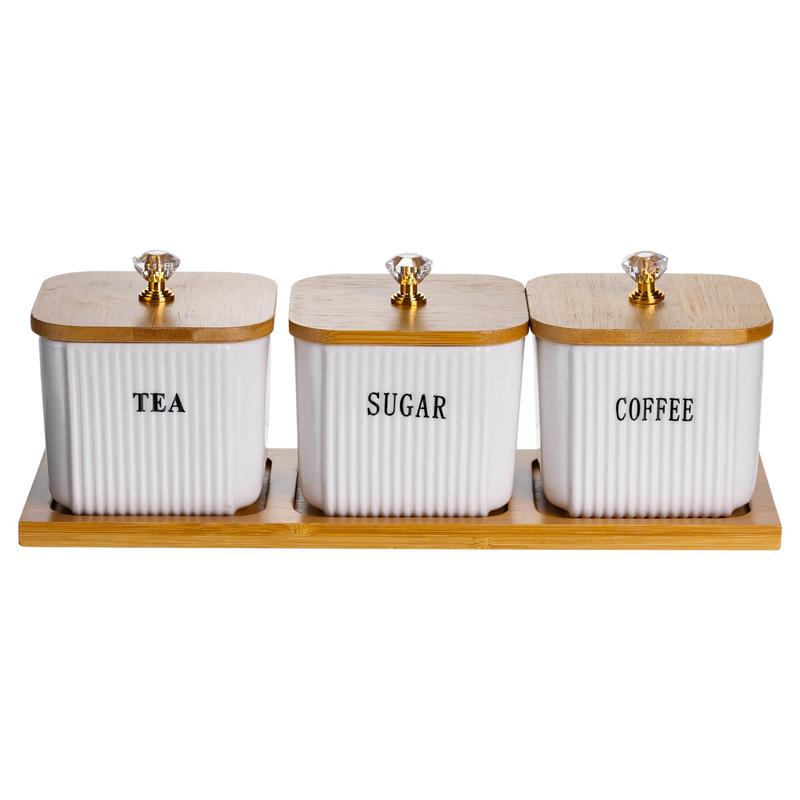 Набір із трьох порцелянових банок із бамбуковими кришками -- це практичне й елегантне рішення для зберігання чаю, кави, цукру та інших сипких продуктів. Завдяки продуманому дизайну він допомагає підтримувати лад і додає вишуканості кухонному простору. Основні характеристики місткостей для зберігання цукру, чаю та кави: Матеріал: порцеляна, бамбук; Розмір: 29.5×10.5×11 см; Діаметр баночок: 9 см; Висота баночок: 7 см; Об'єм баночок: 350 мл. Такий набір стане не тільки функціональним елементом кухні, але і стильним акцентом в інтер'єрі. Він ідеально підійде в подарунок поціновувачам затишку та ладу, додавши до повсякденного побуту нотку елегантності.
