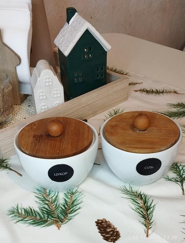 ♥️Гарний набір банок ємність для цукру і солі ✔️Самі баночки це кераміка,кришки бамбук ✔️Стан чудовий .Користувалась півроку.Одна баночка всередині нерівна ,але я так купляла,це видно з середини,тому непомітно. ✔️Наклейки мли , їх легко зняти 💳Оплата на картку.
