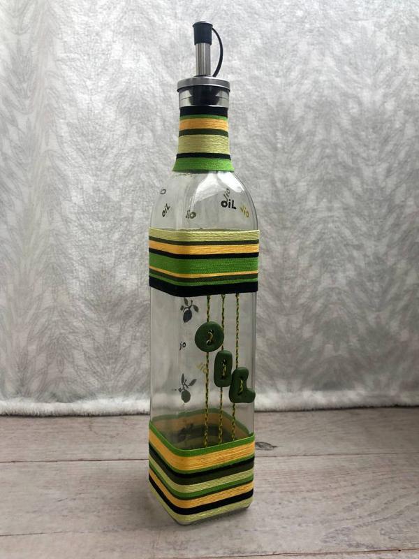 Ексклюзивна декоративна пляшка для олії ручної роботи від дизайнера Alex.Sam.Art. Створена майстром в одному екземплярі. Прекрасно доповнить інтер'єр будь-якої кухні! Гарний подарунок для друзів та близьких. Матеріал - скло, акріловы фарби, нитки висота - 300 мм дно - 55х55 мм
