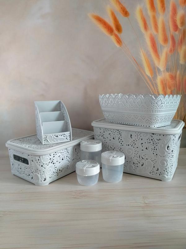Набір контейнерів "Ажур", емкостей для спеції, ажурної підставки та прямокутної сухарниці, саме те що потрібно щоб задовільнити потреби в мінімальній організації простору на кухні та кімнаті. Ажури в комплекту на 7,5 та 4,7 л легко помісять в себе канцелярію, спеції чи будь які інші дрібні предмети. Підставка на три відділення ідеально підійде для зберігання пензликів для макіяжу або канцелярію, а фруктовниця вмістить в себе все інше.