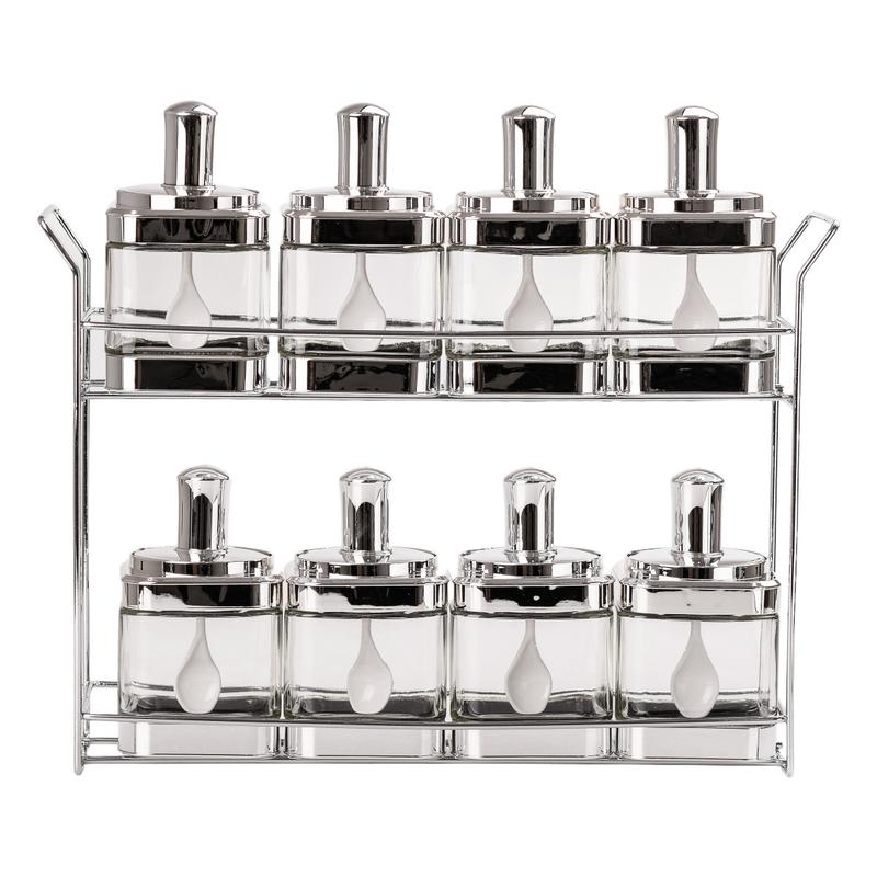 Банки для сипких продуктів у наборі з 8 штук - скляні ємності для зручного зберігання з ложками, що представлені на двоярусній металевій підставці. Кожен ярус підставки вміщує по 3 банки, забезпечуючи компактне та акуратне розміщення. Герметична кришка збереже свіжість продуктів і запобігає попаданню вологи та комах. Ложка в комплекті дозволяє зручно набирати необхідну кількість продукту. Металева підставка забезпечує зручне зберігання банок на столі чи полиці. Банки можна мити в посудомийній машині для легкого чищення. Переваги: Прозорі стінки дозволяють легко бачити вміст Герметична кришка зберігає свіжість продуктів Ложка в комплекті для зручного набору Підходить для миття в посудомийній машині Стильний дизайн прикрасить вашу кухню