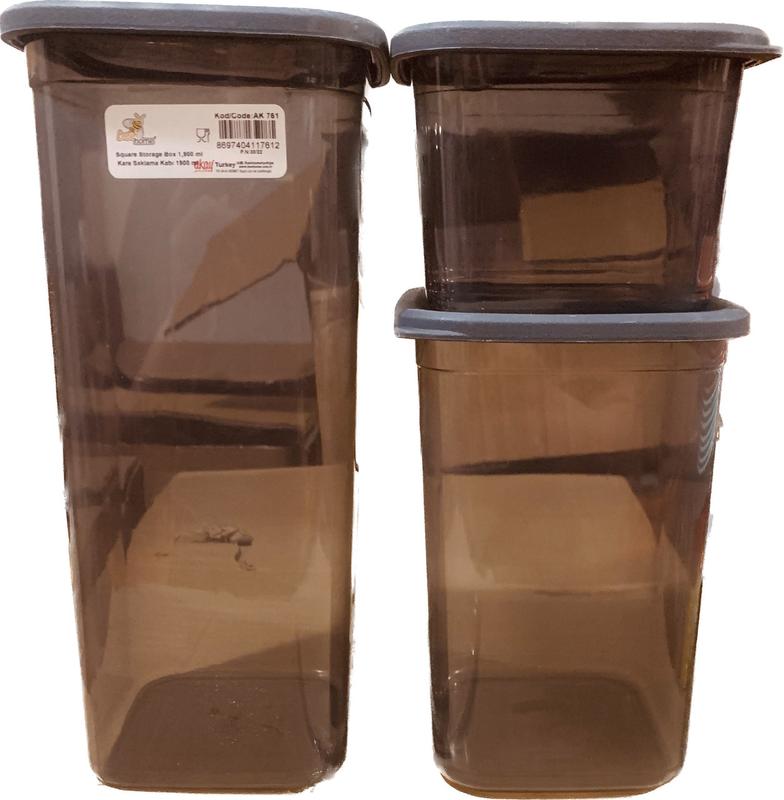 Набір 3-пр контейнерів для сипких (0,65 л + 1,3 л + 1,9 л) AKAY Plastik, Туреччина АК-767 Набір із трьох квадратних, пластикових контейнерів — турецького виробництва ТМ AKAY Plastik. Призначений для зручного зберігання харчових продуктів, включно з кругами, сухофрукти, спеції та будь-якими іншими продуктами. Контейнери містять щільні кришки, що дає змогу довго зберігати сипки продукти та можуть використовуватися для мікрохвильової печі, нагрійте їжу до 100 °C. Можуть використовуватися в холодильниках і морозильниках, досить компактні та місткі. Можна мити в посудомийній машині. Ці ємності виготовлені в різних варіаціях кольору. Контейнери виготовлені з першокласного, високоякісного гіпоалергенного поліпропілену, абсолютно нешкідливий харчовий пластик. Вся продукція відповідає міжнародному стандарту якості ISO 9001. Термін придатності необмежений. Ящики для зберігання є остаточним рішенням для зберігання сухих продуктів на кухні, розміри та вміст відповідають загальній кількості упакованих сухих продуктів і розмірам сучасних кухонних ящиків, кухонних шаф і холодильників. Добре подрібнювач ски для зберігання з прозорою кришкою вікна склад набору: 1 шт - 1900 мл 1 шт - 1300 мл 1 шт. — 650 мл