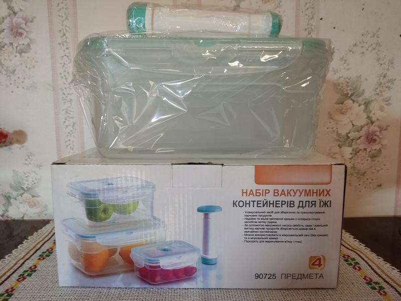 набір вакуумних контейнерів для їжі, набір з 3-х контейнерів з кришками в насоса 500 мл, 1200мл, 2500мл, матеріал: пластик, виробник: Китай. Універсальний для зберігання та транспортування харчових продуктів. Надійне та міцне кріплення кришки з чотирьох сторін запобігає витіку родини. За допомогою вакуумного насоса свіжість, смак в зовнішній вигляд харчових продуктів зберігається довше ніж в звичайних контейнерах. Можна використовувати в мікрохвильовій печі ( без кришки) та в морозильній камері. Підходять для маринування м'яса в птиці.