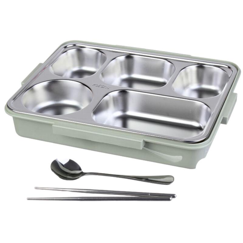 Розмір: 30 х 24 х 7 см, об'ем 1400 мл Матеріал: харчовий пластик, нержавіюча сталь Комплектація: металева ложка, палички Особливості: ланч-бокс розділений на 5 відділень Цей ланч-бокс оливкового кольору ідеальний для тих, хто вважає за краще насолоджуватися домашньою їжею поза домом. П'ять секцій допомагають підтримувати порядок, не даючи ароматам різних страв змішуватися. У кришці контейнера є спеціальний відсік для столових приборів. Металева ложка і палички входять до комплекту цього девайса. Внутрішня частина ланч-боксу виконана з нержавіючої сталі, яку легко чистити і обслуговувати. Чудово підійде для офісних працівників, студентів або любителів активного відпочинку.