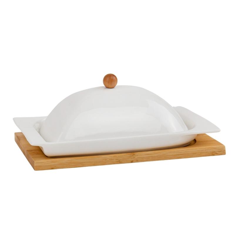 Бамбуковая подставка, на которой размещена масленка, не только придает устойчивости и стабильности этому предмету, но и является декоративным элементом. Бамбук - это крепкий, экологически чистый материал, который придает теплу и естественности кухонному интерьеру. Такая масленка на бамбуковой подставке является практичным и стильным дополнением к кухонному инвентарю, позволяя хранить масло свежим и удобно использовать его во время приготовления блюд. Ширина - 19 см, длина - 12 см. Масленка упакована в белую картонную коробку.