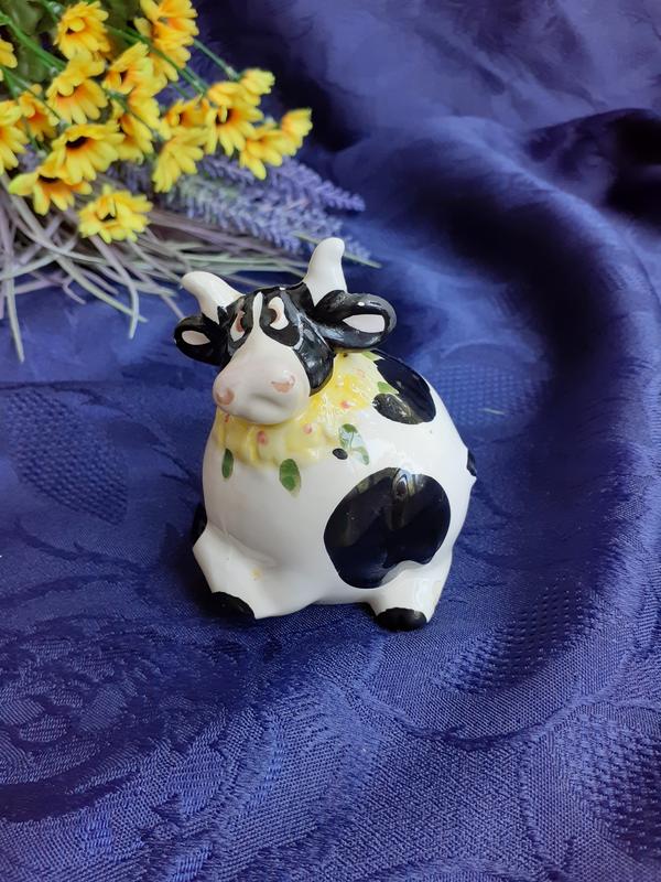 Вашему вниманию миниатюрный предмет сервировки праздничного стола, - акцент в мелочах, "изюминка" декора, - винтажная спецовочница! Это баночка для соли или молотого перца! Изготовлена в виде пятнистой коровки или бычка из опака - особого вида фаянса, схожего с фарфором. Покрыта эмалями и глазурью. Достаточно крупная. Высота - 7 см, диаметр функциональной части - 6 см. ❗Состояние хорошее, но имеет незначительный скол эмали (фото 10)❗