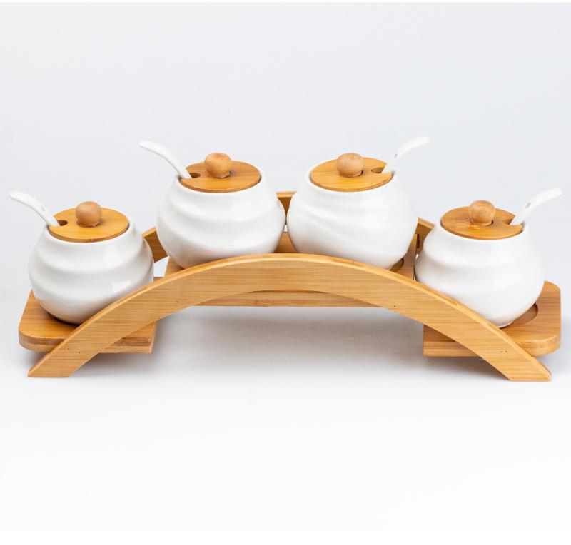 Цей набір баночок для спецій з бамбуковою підставкою стане чудовим доповненням до вашої кухні. Він складається з 4 керамічних баночок білого кольору з дерев'яними кришками та керамічними ложками. Баночки мають лаконічний дизайн, який гармонійно поєднується з будь-яким інтер'єром. Кришки щільно прилягають до баночок, а це дозволяє зберігати спеції свіжими та ароматними, а керамічні ложки зручні для набирання та використання спецій. Бамбукова підставка забезпечує стійкість та зручне зберігання баночок. Цей набір баночок для спецій - це не лише практичний, але й стильний подарунок для будь-кого, хто любить готувати. Він стане чудовим доповненням до будь-якої кухні та допоможе вам організувати та зберегти ваші улюблені спеції. Переваги: Зберігає спеції свіжими та ароматними Елегантний дизайн доповнить будь-який інтер'єр Виготовлений з екологічно чистих матеріалів Легко чистити Зручний у використанні Чудовий подарунок
