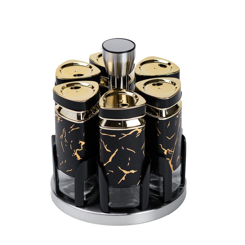 Набір для спецій з підставкою — це функціональне рішення з 6 баночками, що стане незамінним помічником на вашій кухні. У ньому зручно зберігати різноманітні спеції, трави та приправи, завжди маючи їх під рукою для створення кулінарних шедеврів. Металева двоярусна підставка дозволяє компактно організувати всі баночки, надаючи кухні стильного вигляду. Характеристики та переваги Кількість банок: 6 Об’єм банок: 120 мл Розмір: 15 x 15 x 18,5 см Двоярусна металева підставка для зручності використання Заходи безпеки Рекомендується мити баночки вручну, уникаючи агресивних абразивів, щоб зберегти їх привабливість. Не залишайте підставку на прямому сонці, щоб уникнути деформації металевих елементів.