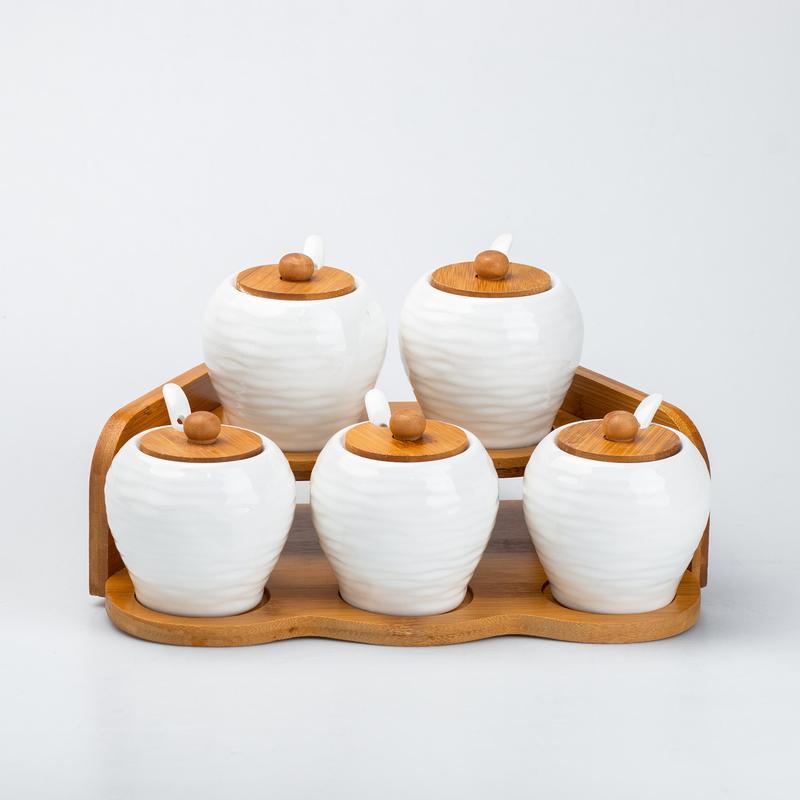 Набір з 5 керамічних баночок для спецій з бамбуковими кришками та керамічними ложками стане стильним і практичним доповненням вашої кухні. Елегантні білі баночки з гладкою поверхнею впишуться в будь-який інтер'єр, а бамбукові кришки щільно прилягають, зберігаючи спеції свіжими та ароматними. Зручні керамічні ложки роблять використання спецій ще приємнішим. Характеристики: Кількість баночок: 5 шт. Матеріал баночок: Кераміка. Матеріал кришок: Бамбук. Ложки: Керамічні. Підставка: Бамбукова. Основні переваги: Зберігання спецій: Щільні бамбукові кришки зберігають спеції свіжими та ароматними. Елегантний дизайн: Білий колір та гладка поверхня баночок доповнюють будь-який інтер'єр. Екологічність: Виготовлений з безпечних та екологічно чистих матеріалів. Легкість у догляді: Баночки та ложки легко чистити. Зручність: Підставка забезпечує порядок на кухонній поверхні і зручність у використанні. Догляд: Рекомендується мити баночки вручну. Підставку можна протирати вологою ганчіркою. Цей набір стане чудовим подарунком для будь-якого кулінара, поєднуючи практичність та стиль.