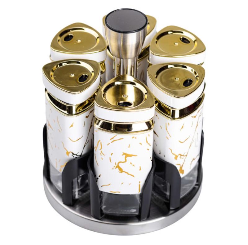 Набор баночек для специй на подставке состоит из шести стеклянных емкостей объемом 120 мл. Высота каждой баночки - 12,5 см, что обеспечивает достаточный объем для хранения различных специй. Крышечки изготовлены из пластика с имитацией мрамора, что добавляет набору элегантный вид. Они плотно закрываются, предотвращая попадание влаги и сохранение аромата приправ. Подставка выполнена из металла и пластика, имеет высоту 19 см и диаметр 15 см. Ее конструкция обеспечивает удобное вертикальное расположение баночек, экономя место на кухонном столе. Благодаря стильному дизайну набор станет не только практичным, но и декоративным элементом кухни. Этот набор идеально подходит для хранения специй, трав, соли, перца и других приправ. Баночки можно мыть в посудомоечной машине (без крышек), а подставку рекомендуется очищать вручную влажной салфеткой. Характеристики: Количество емкостей: 6 штук Объем: 120 мл Высота баночек: 12,5 см Высота подставки: 19 см Диаметр подставки: 15 см Материал баночек: стекло Материал крышек: пластик (имитация мрамора) Материал подставки: металл + пластик Назначение: для хранения специй