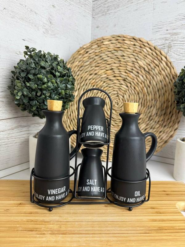 Набір для спецій 5 предметів Maestro ❤️ Комплектація : -Місткість для оцту 300 мл -Ємність для олії – 300 мл -Перечниця -Сільничка -Підставка Матеріал : кераміка