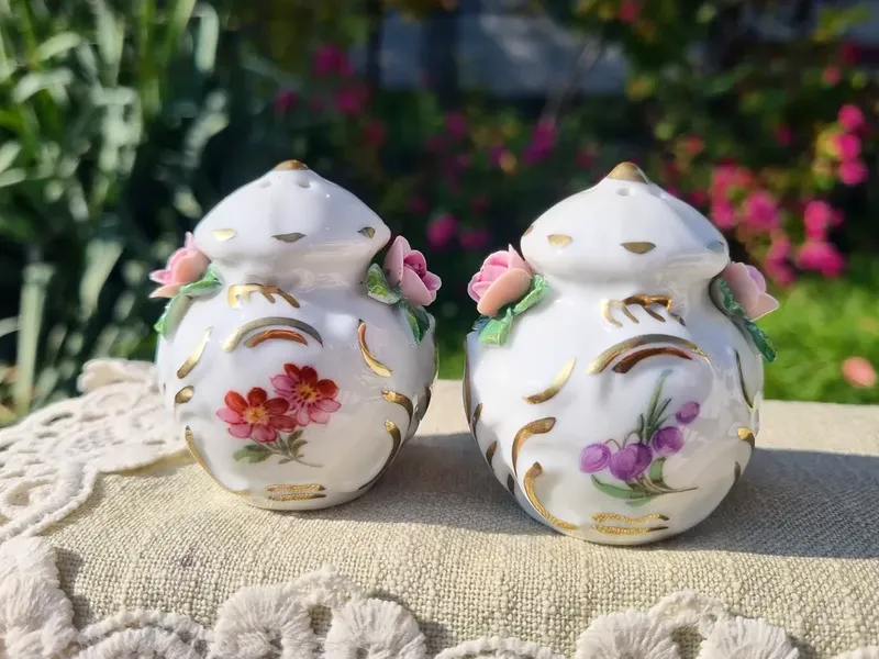 Наймиліший набір для спецій (сіль, перець). Квіти. Німеччина. Дивовижна робота з найтоншою деталізацією. Дрезденська порцеляна, позолота. Прекрасний стан із мікроковітками на кольорах, немає одного листочка.