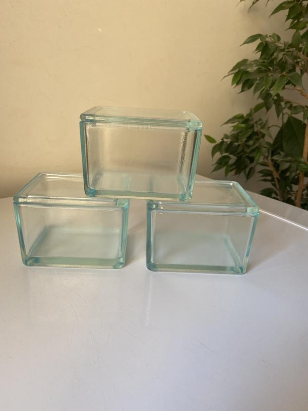 Стеклянная ёмкость с крышкой. 10х8., высота-7см. Стильная и удобная. Цена за 1 шт-25 грн.Есть 100шт.