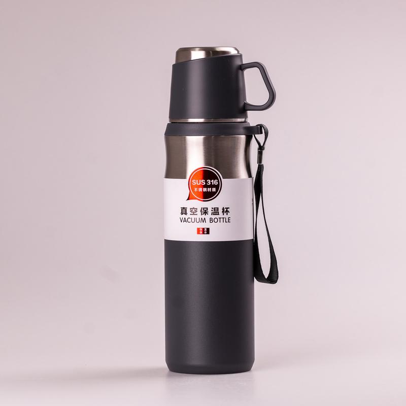 Термос с чашкой и ремешком 600 мл с металлической колбой серый