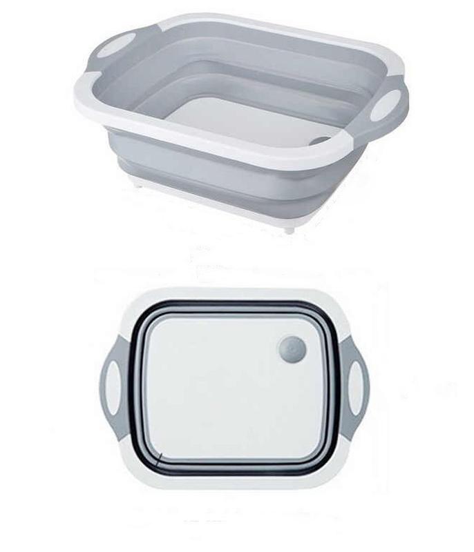 Дошка має отвір для зливу води. Стінки контейнера із силікону складаються, перетворюючи контейнер на дошку для нарізування та подрібнення продуктів. Просто помістіть овочі у контейнер, відкрийте зливний отвір, ретельно вимийте продукти та просушіть. Складіть стінки контейнера та користуйтеся дошкою для подрібнення та нарізки. Підніміть стіни, щоб використовувати контейнер для зберігання продуктів. Компактний дизайн та універсальність застосування роблять цей предмет незамінним на кухні. Дошка не займає багато місця у шафі, її зручно зберігати у складеному стані. Екологічні матеріали та міцний пластик гарантують тривалий термін служби.