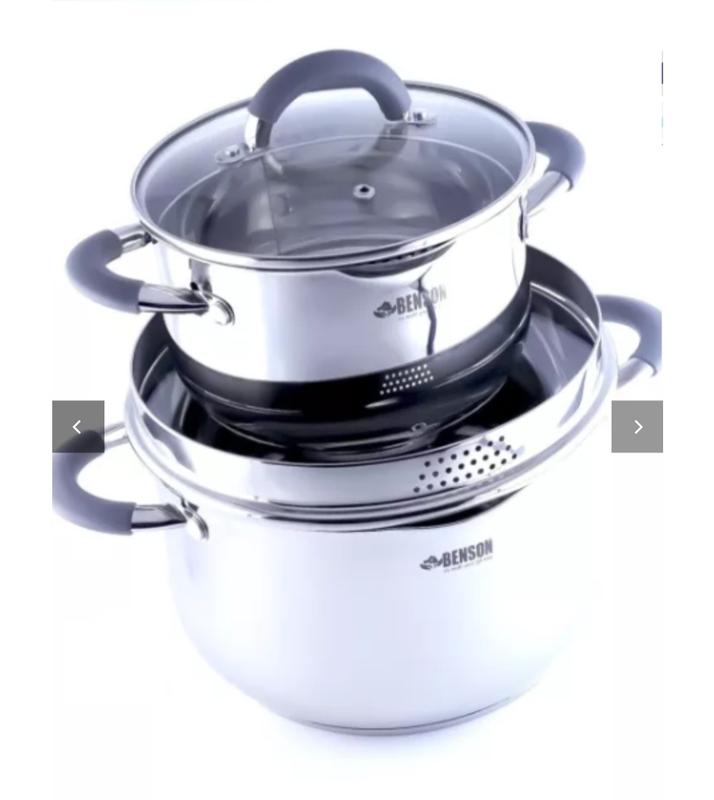 Набір з двох кастрюль нержавіюча сталь кришки мають заниження обідка в якому розташовані отвори ля зливу ридини,дуже зручні Розмір мають два набори 3 л і 6 л.Є ще великі набори з 4 кастрюль вони не мають в кришках отворів ,вони звичайні нерж.сталь