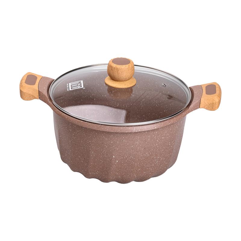 Кастрюля из алюминиевого сплава станет отличным дополнением к вашей кухне благодаря своему современному дизайну и функциональности. Мраморное антипригарное покрытие обеспечивает равномерный нагрев и предотвращает пригорание пищи, что делает ее идеальной для ежедневного использования. Объем 8 литров позволяет готовить не большие порции блюд. Кастрюля легко чистится благодаря антипригарному покрытию, что также повышает ее долговечность. Вы сможете наслаждаться приготовлением любимых блюд без лишних усилий по уходу за посудой. Основные характеристики кастрюли Объем 8 л Диаметр 28 см Высота сковороды без крышки 15,2 см Высота кастрюли с крышкой 20,2 см; Толщина дна 5,5 мм. Преимущества кастрюли. Подходит для газовых, электрических и индукционных плит; Не вступает в реакцию с пищей; Имеет толстое дно для идеального распространения тепла. Меры предосторожности Перед первым использованием вымойте в теплой воде с мягким моющим средством, протрите губкой и вытрите насухо. После полного высыхания протрите антипригарное покрытие небольшим количеством растительного масла. Используйте силиконовые или деревянные столовые приборы, чтобы защитить поверхность от царапин. Категорически не рекомендуется использовать металлические ложки или лопатки. Не оставляйте пустую кастрюлю на огне. Не используйте жесткие губки и щетки, абразивные пасты и порошки, а также агрессивные чистящие средства.