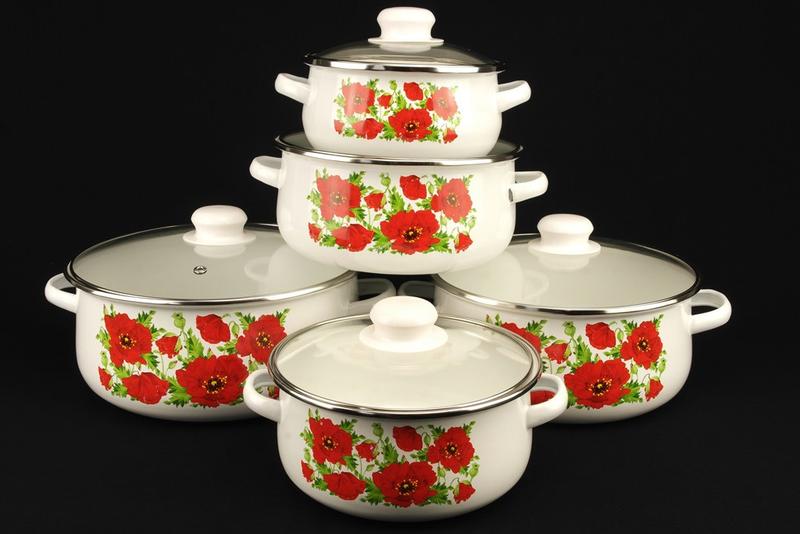Набір емальованих каструль зі скляною кришкою 5 предметів маки