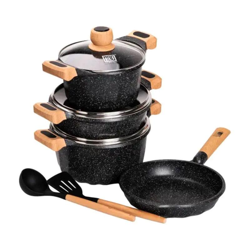 Набор посуды, 3 кастрюли, с толстодонной алюминиевой лопаткой и половником mgc, черный hp-...