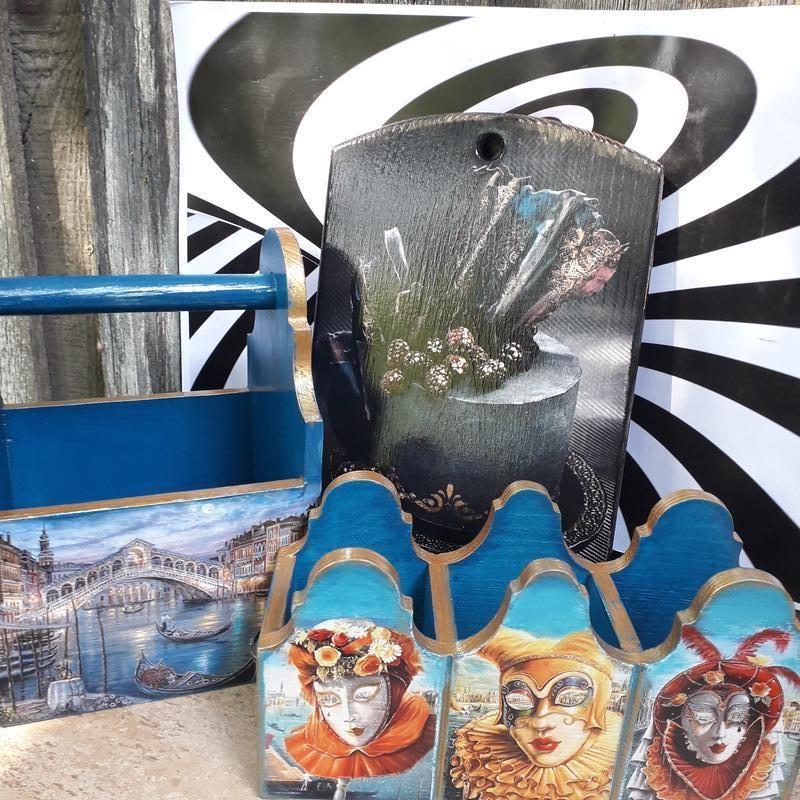 Набір "ВЕНЕЦІЯ складається : 1.Короб з ручкою 17*15*24,5 см(сосна); 2.Підставка-органайзер на три клітинки 25,5*8,5 см. висота 13,5 см(сосна); 3. Разделочно-сервірувальна дощечка з ясена , розмір 26*19см. Зворотна сторона робоча. Всі елементи набору дуже функціональні та виготовлені з якісних заготовок з натурального дерева. На кухні у вас все буде під рукою і одному стилі. А головне - красиво, не завжди і таких органайзерів ні в кого не буде.