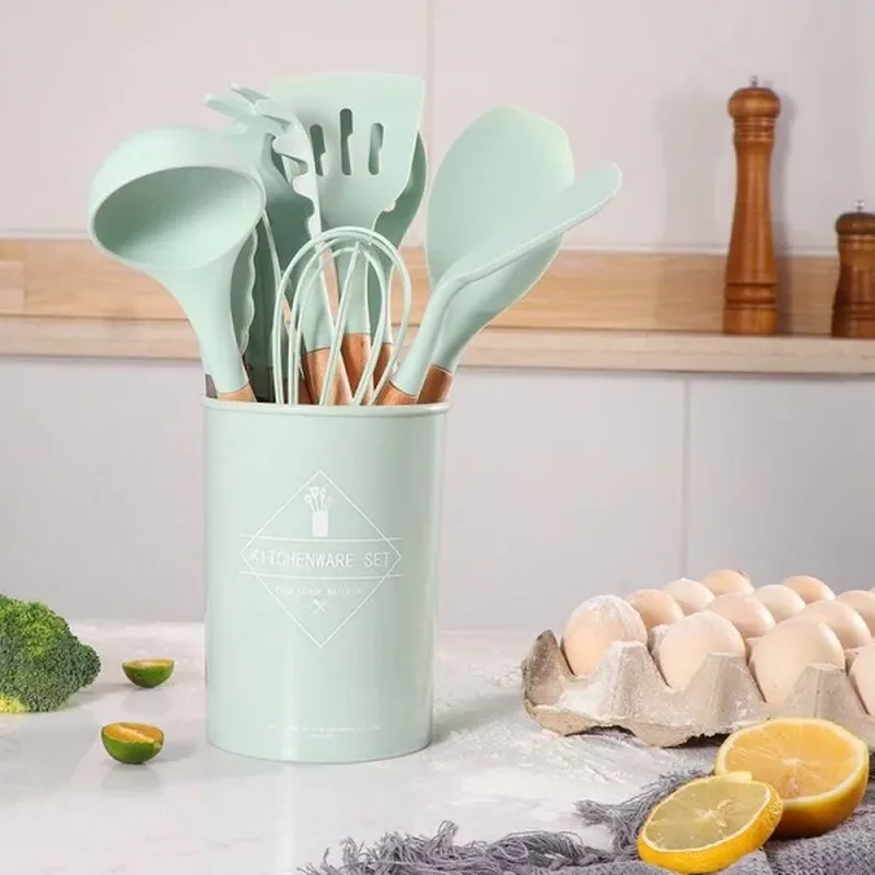 Набір кухонного приладдя складається із 12 предметів. Зроблений із силікону та бамбуку, має антипригарне покриття. Кухонний набір безпечний для використання з харчовими продуктами. Він не має запаху. Витримує температуру до 230 градусів. Високоякісний силікон - відмінний матеріал для кухонного приладдя, оскільки він не залишає подряпини на посуді Матеріал інструментів: силікон, бамбук; Матеріал відерця: пластик; Вага: 1200 г; Максимальна температура: 230 градусів цельсія; Країна виробник: Китай.