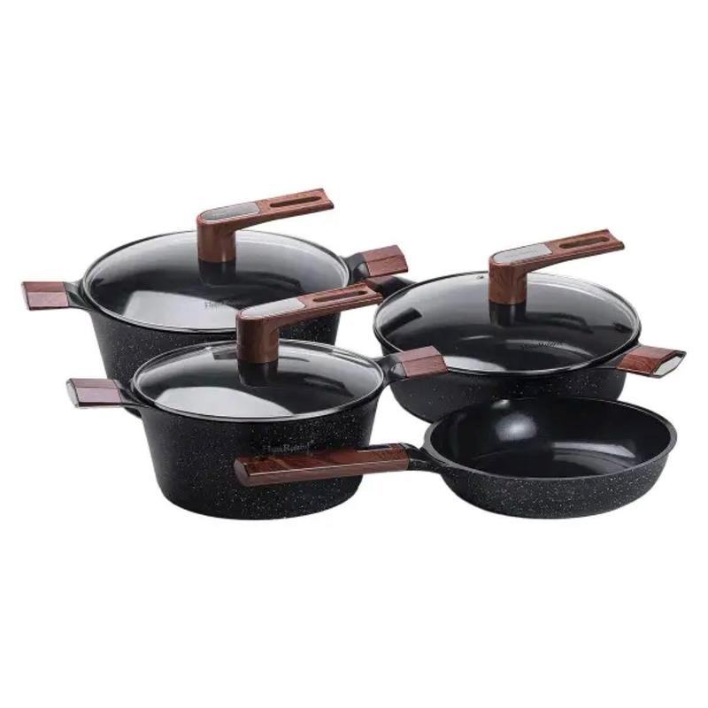 Набір посуду включає три каструлі з кришками з жароміцного скла та сковороду без кришки. Каструлі мають елегантні дерев'яні ручки та виготовлені з алюмінію з мармуровим покриттям, що забезпечує високу тепловіддачу та рівномірний розподіл тепла. Цей набір поєднує в собі функціональність та стиль, що робить його відмінним вибором для будь-якої кухні. Характеристики: Каструля 7.7 літра: розмір 28×12.5 см Каструля 5.0 літрів: розмір 24×11 см Каструля 4.9 літра: розмір 28×8 см Сковорода 2.5 літри: розмір 24×5.5 см Переваги: Виготовлені з алюмінію з мармуровим покриттям, яке є безпечним для здоров'я і запобігає пригоранню їжі Висока тепловіддача і рівномірний розподіл тепла для швидкого та ефективного приготування страв Міцна та довговічна конструкція для тривалого використання Антипригарне покриття робить процес приготування їжі комфортним і легким у догляді Догляд: Для збереження поверхні рекомендується використовувати м’які губки при митті Уникайте використання абразивних речовин і жорстких щіток, щоб уникнути пошкоджень