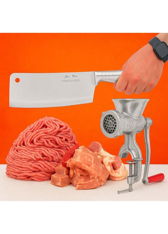 Механічна м'ясорубка виготовлена з алюмінієвого литого корпусу. Надійна та ручна м'ясорубка для подрібнення м'яса, риби, горіхів та овочів. Модель відрізняється високою продуктивністю — до 33 кг на годину, що дає змогу переробляти великі обсяги м'яса за короткий час. У комплекті передбачена насадка для приготування ковбас, а також зручний тесак для м'яса, який допоможе швидко обробляти великі шматки перед подрібненням. М'ясорубка легко закріплюється на столі за допомогою гвинта, що забезпечує її стійкість під час роботи. Вона не вимагає електрики, тому підходить для використання вдома, на дачі або в умовах, де немає доступу до мережі. Корпус низу оснащений ніжками з гумовими накладками та гвинтовим затискачем. Гвинтовий затискач закручується, щільно притискає ніжки до стільниці, що не дає приладу зміщуватися під час роботи. Тримати у недоступному для дітей місці. Перед використанням помити та висушити. Характеристики м'ясорубки Матеріал: харчовий алюміній Розміри: 23х15х8.5 см Розміри в упаковці: 27х15х13 см Вага: 1.1 кг Насадка для приготування ковбас: є Діаметр сітки для м'ясорубки: 54 мм Діаметр отворів у сітці: 7 мм Виробник: Україна Комплектація м'ясорубки Корпус М'ясоприймач Ніж Сітка Шнековий вал Притискна гайка Ручка Гвинт для закріплення ручки Силіконові накладки Характеристики тесака Матеріал леза: нержавіюча сталь Матеріал ручки: нержавіюча сталь Загальна довжина: 27 см Висота леза: 8.5 см Довжина леза: 15.5 см Товщина металу: 3 мм Вага: 188 г Країна-виробник: Китай