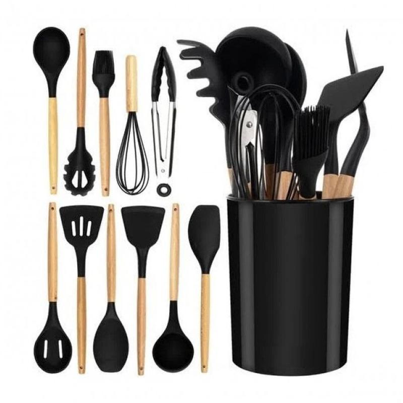 Набір кухонного приладдя Kitchen Set - це зручний та практичний комплект інструментів, призначених для допомоги у приготуванні їжі. Цей набір включає 12 різних предметів, кожен з яких служить своєю унікальною функцією, дозволяючи вам виконувати різноманітні завдання на кухні. Комплектація: - Пензлик. - Щипці. - Віночок. - Ложка з прорізом. - Половник. - Ложка для спагетті. - Ліжка для сервірування. - Лопатка з прорізом. - Лопатка - 2 шт. - Ложка для салату. - Підставка