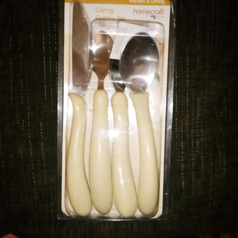 В набір входять: ніж, ложка, виделка та чайна ложка. Набір запакований в блістер. Без дефектів.