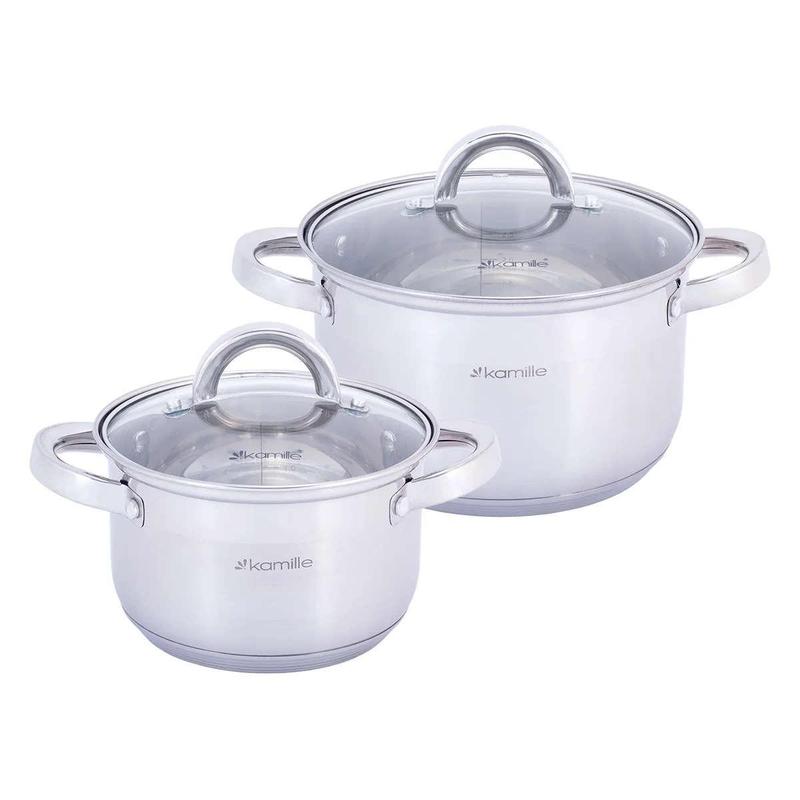 Набір каструль Kamille з неіржавкої сталі 4 предмети KM-5627S До набору посуду Kamille входять: -каструля з кришкою 2.1 л (Ø 16 х 10.5 см) — 1 шт. — каструля з кришкою 3.8 л (Ø 20 х 12.5 см) — 1 шт. Характеристики: - Виготовлений з неіржавкої харчової харчової стали високого маркування — Дно каструль 5-шарове капсульне. - Ручки мають заклепкове з'єднання. - Конструкція ручок порожниста, завдяки якій вони не нагріваються. - У скляних кришок передбачений отвір для виходу пари, металевий обідок і металева порожня ручка. Особливості: - виготовлений із високоміцної неіржавкої сталі, що не піддається корозії та потемнінню — ідеальний для інтенсивного використання, стійкий до зносу — має п'ятишарове капсульне дно — вирізняється високою теплопровідністю й розподілом температури, що забезпечує швидке нагрівання та тривале утримання тепла — придатний для будь-яких різновидів плит — придатний для миття в посудомийній машині — зручний у використанні та догляді Догляд за посудом: - перед початком використання необхідно видалити з вироби всі ярлики й елементи паковання, ретельно вимити виріб і просушити — після кожного використання дочекатися охолодження виробу, потім ретельно вимити та просушити — не рекомендується використовувати абразивні мийні засоби та металеві щітки — Використання та правила безпеки: - не піддавати виробам різким змінам температури — не залишати порожній посуд на вогні — уникати потрапляння полум'я на ручки й бічні стінки посуду — не використовувати гострі металеві аксесуари