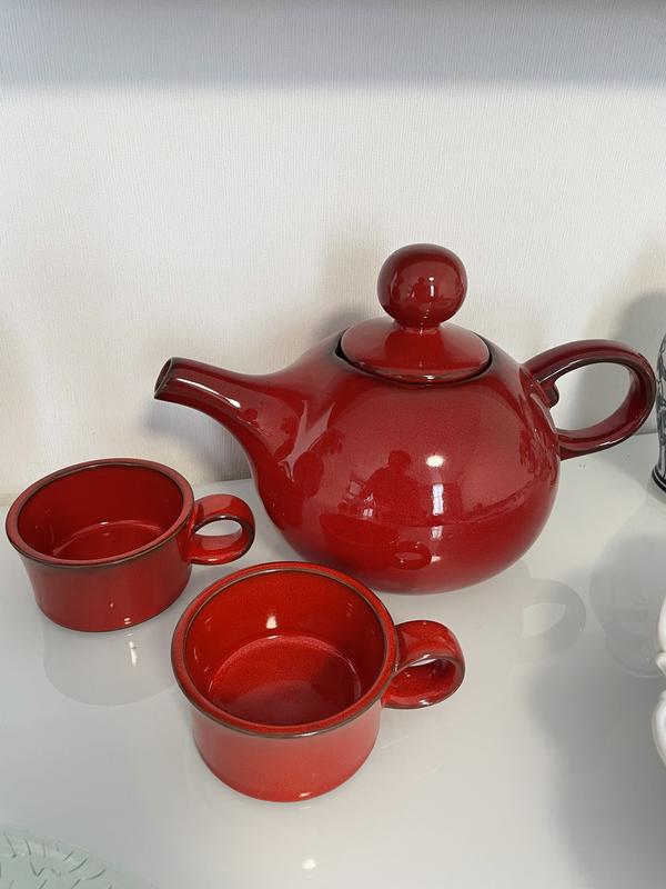Чайник 1,2 літра об’єм, Виробник Melitta Ceracton Німеччина 1970-ті роки Мають унікальний красивий червоний колір і неймовірно цікаву форму. Ємність 135 мл. Висота 4,5 см/ ширина 8 см. Без клейма.