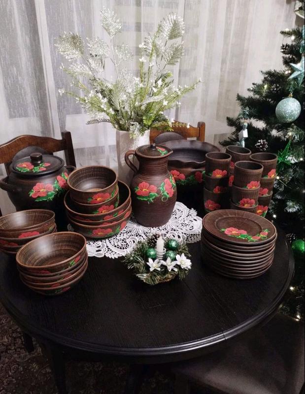 Набір глиняний мак на 6осіб🔥🔥🔥 Тарілка 19см гладка 6 шт Стакан 400мл гладкий 6 шт Піала 0,5л 6шт Макітра 1,5л хвилька 1 шт Кувшин 2,5л 1 шт Супник 1шт-1.8л