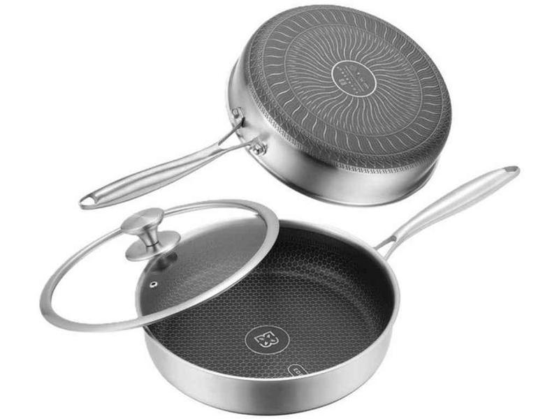 Глибока Сковорода З Кришкою Розмір 28x7,0 см., (4,0 Лтр.) Тришаровий Матеріал Із Нержавіючої Сталі Внутрішній — Текстурована Нержавіюча Сталь З Антипригарним Покриттям (Стільниковий Текстурована) Середній - Алюміній Для Кращого Розподілу Температури Зовнішній - Нержавіюча Сталь Дно - Текстурована Нержавіюча Сталь (Стільниковий Текстурована) Внутрішнє Чорне Тефлонове Антипригарне Покриття, Гладке Та Елегантне Зовнішнє Покриття, Стильна Та Ергономічна Ручка З Нержавіючої Сталі. Скляна Кришка З Кнопка З Нержавіючої Сталі - Легко Носити Легке Приготування, Легко Очистити, Підходить Для Всіх Типів Плит, Включаючи Індукційні. Можливо Використовувати В Духовці До 220 ° С Можливо Мити В Посудомийній Машині Упаковка Подарункової Коробки Важливо Ручка Знімна - Можна Зняти Ручку, Відкрутивши Гвинти, Тому Можна Легко Використовувати В Духовці