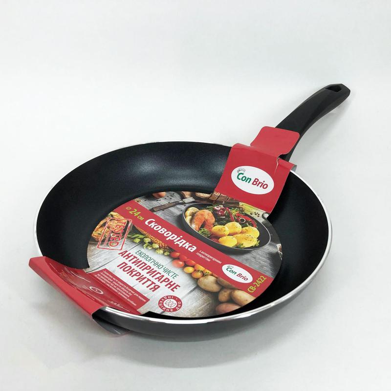 Сковорода с антипригарным покрытием Con Brio - Новейшее антипригарное покрытие наиболее устойчиво к механическим повреждениям и царапинам, безопасно для здоровья человека и обладает прекрасной теплопроводностью - Утолщённый алюминиевый корпус равномерно распределяет температуру по всей поверхности сковороды - Прорезиненная термостойкая ручка Soft Touch не скользит в руке - Надежное клепочное крепление ручки - Индукционное дно FULL INDUCTION - позволяет использовать сковороду на всех типах плит - Диаметр сковороды 24 см