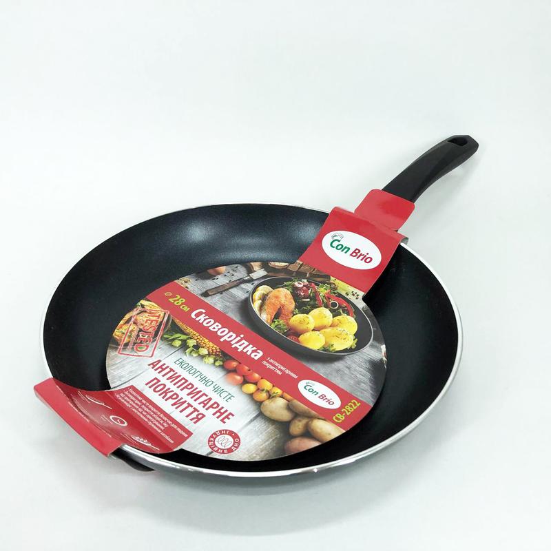 Сковорода з антипригарним покриттям Con Brio - Нове антипригарне покриття найбільш стійке до механічних пошкоджень і подряпин, безпечне для здоров'я людини і має чудову теплопровідність - Потовщений алюмінієвий корпус рівномірно розподіляє температуру по всій поверхні сковороди - Прогумована термостійка ручка Soft Touch не ковзає в руці - Надійне клепкове кріплення ручки - Індукційне дно FULL INDUCTION - дозволяє використовувати сковороду на всіх типах плит - Діаметр сковороди 28 см