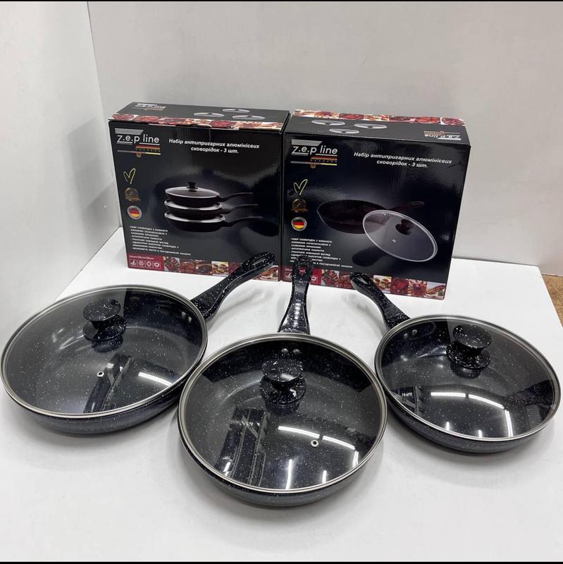 Набір антипригарних алюмінієвих сковорідок зі скляними кришками 3 шт zepline