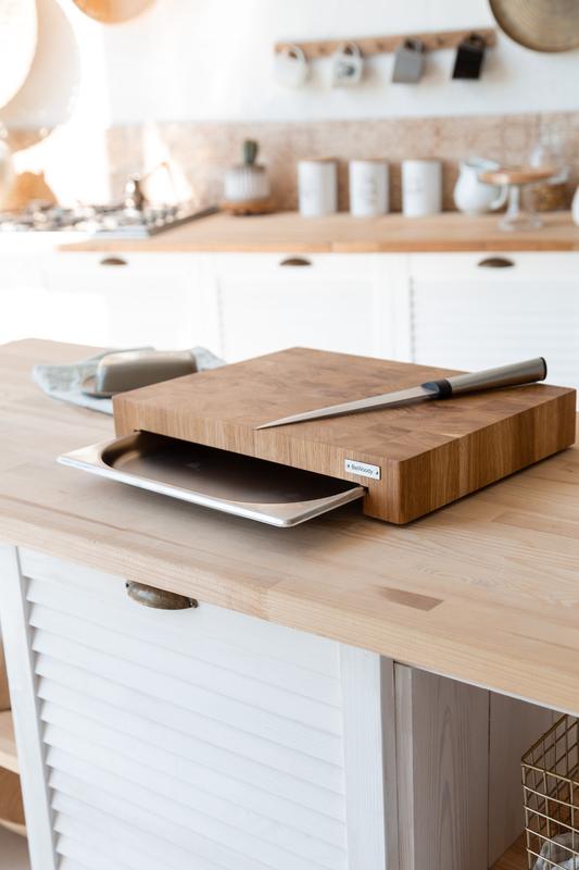 Професійна дубова дошка з гастрономічною ємністю для вашої кухні - для нарізки та шинкування - висувна гастроємність, що повністю витягується, об'ємом 1.3 літра з харчової нержавіючої сталі забезпечує зручність при різанні: продукти можна відразу з дошки складати в неї. - дошка не тупить кухарський ніж - глибока обробка деревини бджолиним воском у поєднанні з мінеральною олією захищає дошку від вологості та забруднень. - знизу дошки встановлені силіконові ніжки - висота дошки загальна 5.5 см - при виготовленні торцевої дошки використовується екологічний клей, що допускає контакт із продуктами харчування. Якість гарантуємо власним виробництвом. Також додатково можливе нанесення індивідуального гравіювання, що додасть дошці оригінальності.