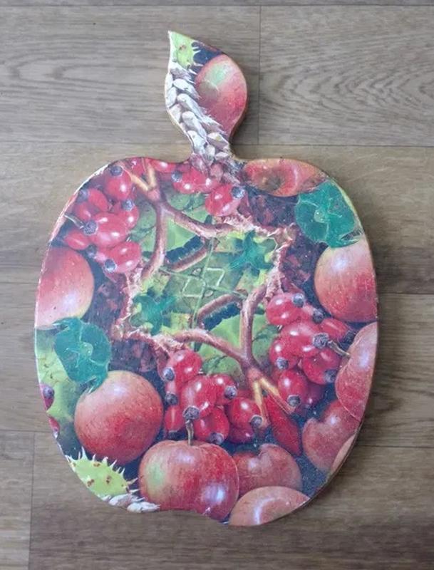 разделочная доска в стиле декупаж Форма доски: большое яблоко Материал доски: бук Размеры 33х23х2 см