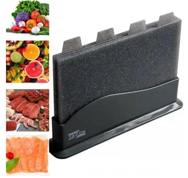 Набір розділових досок на підставку 5 в 1 Zepline ZP-044 5-ти предметний набір складається: Підставка, розмір 33х7,5 см Доска для фруктів, розмір 29х19,5 см, для м'яса, для риби, для гарячих продуктов.