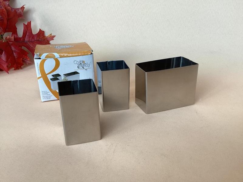 Набір форм (3 штуки) для закусок та десертів від Cosy&Trendy. Привезені з Франції. Матеріал - високоякісна нержавіюча сталь. Розмір-3,5 х3, 5хh5, 5 см і 7х3, 5х5, 5 см. Дуже зручні форми для оформлення, красивої подачі та сервірування салатів, закусок, гарнірів, десертів. Новий стан, продаються в рідній упаковці