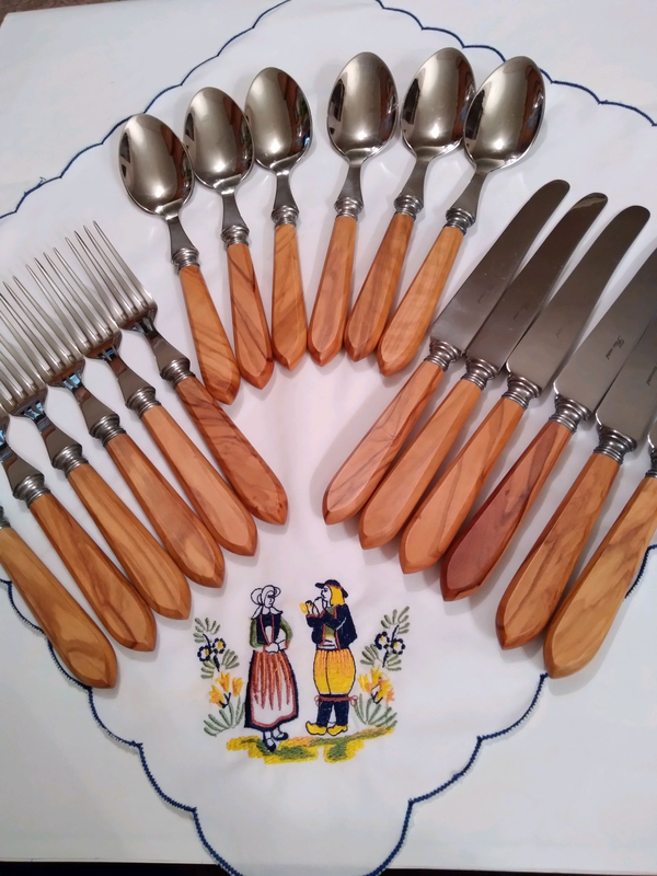 Тип: Набори Набор столовых приборов из 18 предметов - вилки, ножи, ложки из нержавеющей стали с декоративными ручками из высококачественного дерева. Новые, фирменные, добротные, очень красивые. Вилки-6штук, длина - 22см, ножи-6штук, 25см, ложки-6штук, длина - 22см. Нержавеющая сталь 18-10 представляет собой сплав с хромом и никелем (европейский стандарт). Приборы из такого материала высокопрочные, безопасные, долго сохраняют полировку. Все вилки, ножи, ложки имеют надписи. На вилках, ложках - надпись 18-10 INOX FRANCE, на ножах - надпись FLAMANT. Привезены из Франции. Изысканный набор столовых предметов может использоваться для семейных праздников, торжеств , а также повседневно. ❗️Убедительная просьба уточняйте все вопросы до покупки, отвечаю всегда. Вышлю дополнительные фото. Делайте покупку обдуманно. Отправляю оперативно после предоплаты или безопасной оплаты УП, НП. С наложенным платежем не работаю. Желаю удачных покупок.