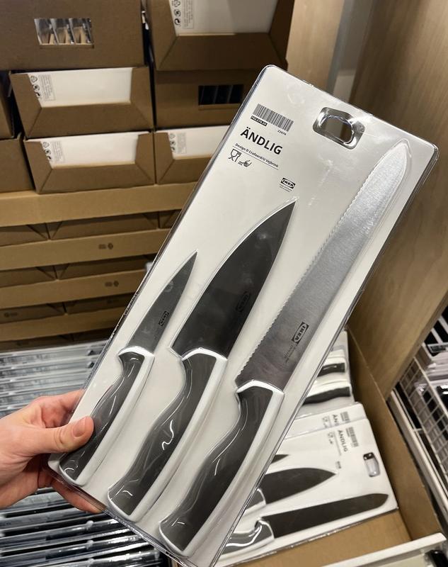 У набір входять: хлібний ніж 23 см (загальна довжина 35 см), кухарський ніж 15 см (загальна довжина 28 см) і ніж для очищення овочів 10 см (загальна довжина 20 см). Подрібніть, наріжте кубиками та скибочками - за допомогою цих трьох ножів у зручному наборі ви зможете приготувати смачні страви для себе та своєї родини. Ножі міцні, стійкі та зручні як для роботи на кухні, так і для вашого гаманця. Виріб можна міцно тримати в руках завдяки продуманому дизайну та матеріалу ручки.