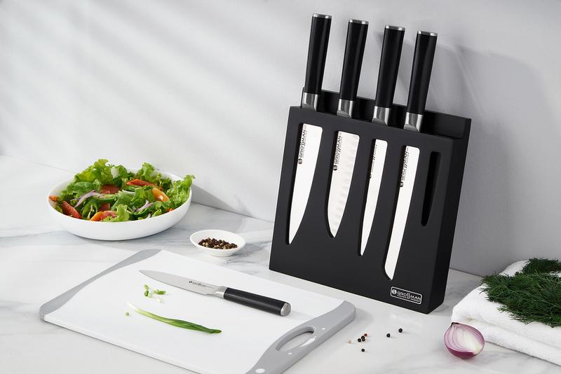 Для отримання консультації ви можете зв'язатися з нашими менеджерами по телефону +38********** або +38********** . Виробник: Grossman Вид ножа: для нарізки та оброблення Марка сталі: 1.4116 Твердість сталі, HRC: 55-56 Довжина леза, мм: 200 Маса колоди без пакування, гр: 2420 Вид упаковки: кольорова картонна коробка Склад набору: 1. Шеф-ніж 2. Хлібний ніж 3. Ніж для нарізки м'яса 4. Сантоку 5. Універсальний ніж Переваги набору: Duncan - набір якісних та ергономічних кухонних ножів від GROSSMAN - Дизайн ножів та підставки виглядає по-справжньому сучасно та презентабельно. Але ножі із набору Dunkan не просто гарні, вони зручні та практичні. Міцні рукояті мають поперечний переріз, який не дозволить ножу провернутися у вашій долоні під час роботи. Своєю лаконічністю та суворим стилем вони сильно нагадують ті ножі, що так люблять японці. - Міцний цільний пластик рукоятей не піддається впливу вологи та гниття. На відміну від традиційних, такі рукояті не утворюють щілин між хвостовиком і накладками, в які може набиватися різноманітне дрібне кухонне сміття. Дизайн та конструкцію ножів у цьому наборі можна охарактеризувати як дуже вдалі. Краса, надійність та практичність не часто зустрічаються разом. Але в даному випадку це безперечно сталося. Клинки ножів виготовлені із нержавіючої сталі марки 1.4116 від німецької компанії TussenKrupp AG. Ця сталь міцна, вона не іржавіє, не покривається плямами. Ножі з неї можна загострити гостро, і цю гостроту вони збережуть надовго. Саме тому нержавіючу сталь 1.4116 використовують для виготовлення ножів та медичного інструменту по всій Європі. Тепер ця якість доступна і вам. Шеф-ніж: цей ніж є невід'ємною частиною будь-якого європейського кухонного набору. Тому що він і є - головне знаряддя праці справжнього шеф-кухаря. Немає роботи, з якою він не впорається. Є роботи, для яких краще підійдуть спеціальні ножі. До речі, вони також є у наборі. Сантоку: Японський аналог шеф-ножа. Ще один чудовий універсал у вашому наборі. Комусь більше подобається працювати шефом, комусь сантоку. На пристойній кухні краще мати і те, й інше. У будь-якому випадку, у роботі з морепродуктів та зелені санток - визнаний чемпіон. Ніж для нарізки м'яса: цей, трохи схожий на меч, ніж відмінно справляється з нарізкою рівними акуратними скибочками м'яса, ковбаси, шинки, балика невимушено і в один рух. До речі, кавуни та дині цим довгим гострим ножем різати теж дуже зручно. Універсальний ніж: на кухні завжди знайдеться робота для якої шеф буде завеликим. Тобто шеф-ножем можна нарізати справді все. Але навіщо? Особливо якщо під рукою є такий зручний та маневрений ніж. Якщо ви купите цей набір, такий ніж у вас також буде. Ніж для нарізки хліба: хліб, як відомо, всьому голова. Тому поводитися з ним слід акуратно. Пилоподібний меч хлібного ножа розріже будь-яку булку рівно, акуратно і без зайвих крихт. Та й свіжу здобу чи торти краще пиляти, а не різати. Так менше шансів їх розчавити та зіпсувати. Більше товару тут, переходьте за посиланням: ************************************************