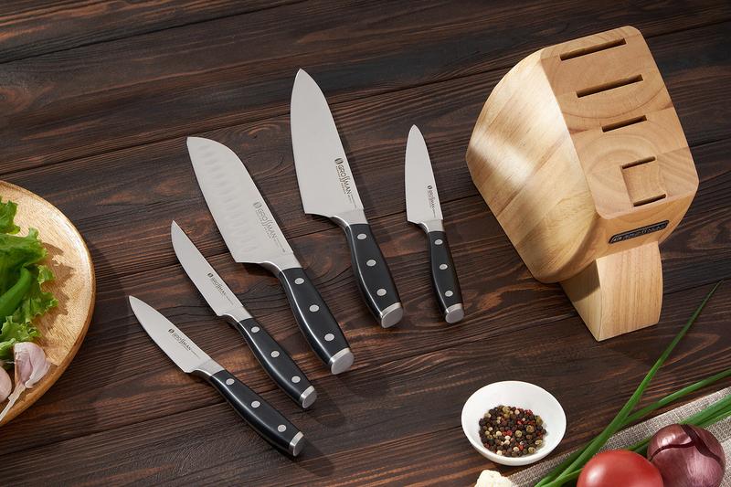Для отримання консультації ви можете зв'язатися з нашими менеджерами по телефону +38********** або +38**********. Виробник: Grossman Тип ножа: для нарізування та оброблення Марка стали: 1.4116 Твердість сталі, HRC: 55-56 Довжина леза, мм: 200 Маса колоди без паковання, гр: 2420 Тип паковання: кольорова картонна коробка Склад набору: 1. Шеф-нож 2. Ніж для очищення овочів 3. Ніж для нарізування м'яса 4. Сантоку 5. Універсальний ніж Ontario - якісний набір кухонних ножів для вашої кухні. У ньому ви знайдете все необхідне від класичного кухарського ножа до ножа для очищення фруктів. Ontario успішно покриває всі кухонні потреби, пов'язані з нарізкою. Вам точно не доведеться імпровізувати та обходитися без потрібного ножа, коли він такий потрібен. Клинки ножів виготовлені з неіржавкої сталі марки 1.4116 від німецької компанії TussenKrupp AG. Ця сталь міцна, вона не іржавіє, не покривається плямами. Ножі з неї можна заточити гостро, і гостроту цю вони збережуть надовго. Саме тому неіржавка сталь 1.4116 використовують для виготовлення ножів і медичного інструменту в усій Європі. Підставка виготовлена з якісного натурального дерева. Всі ножі надійно зберігатимуться у спеціально відведеному для них місці. Дренажні отвори в дні підставки забезпечують захист сталевих мечів від впливу вологи. Шеф-нож: цей ніж -- невіддільна частина будь-якого європейського кухонного набору. Тому що він і є -- головне знаряддя праці справжнього шеф-кухаря. Немає роботи, з якою він не впорається. Є роботи, для яких найкраще підійдуть спеціальні ножі. До речі, вони теж є в наборі. Сантоку: японський аналог шеф-ножа. Ще один чудовий універсал у вашому наборі. Комусь більше подобається працювати шефом, комусь, сантоку. На пристойній кухні краще мати й те, й інше. У будь-якому разі, у роботі з морепродуктами та зелені сантоку -- визнаний чемпіон. Ніж для нарізування м'яса: -- цей, трохи схожий на меч, ніж чудово справляється з нарізуванням рівними акуратними скибочками м'яса, ковбаси, шинки, балика невимушено та в один рух. До речі, кавуни та дині цим довгим гострим ножем різати теж дуже зручно. Універсальний ніж: на кухні завжди знайдеться робота, для якої шеф буде великий. Тобто, шеф-ножем можна нарізати дійсно все. Але навіщо? Особливо якщо під рукою є такий зручний і маневрений ніж. Якщо ви купите цей набір, такий ніж у вас теж буде. Ніж для очищення овочів: цей невеликий ніж ідеально підходить для таких кропітких та акуратних робіт, як очищення від шкірки, видалення серцевини фруктів та нарізування їх тонкими скибочками. Більше товару тут, переходьте за посиланням: ************************************************