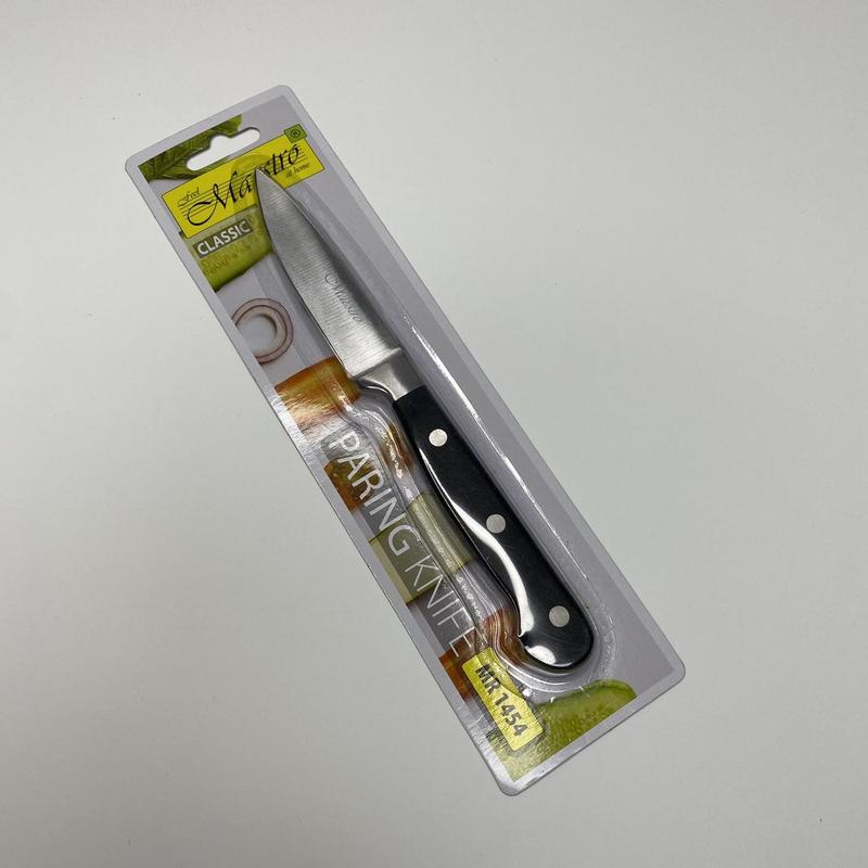 Ніж для овочів неіржавка сталь/пластик 9 см Maestro MR-1454 Ніж для овочів Maestro — це кухонний ніж для зняття шкірки з овочів або фруктів, лезо якого виготовлене з високоякісної неіржавкої сталі, яка вирізняється міцністю і довговічністю, не схильна до корозії та дії кислот, відповідає всім гігієнічним нормам і вимогам, не впливає на смак і проста в догляді. Обладнаний зручною пластиковою ручкою на заклепках. Характеристика: Тип: Ніж Призначення: Для овочів Матеріал: Нержавіюча сталь/пластик Довжина леза: 9 см Колір: Сталевий/чорний Довжина ручки: 11,5 см