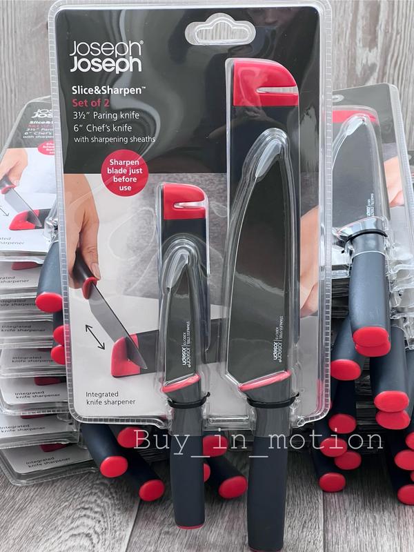 Універсальний набір ножів Slice & Sharpen в чохлах — ще один функціональний дизайнерський проект Joseph Joseph. Леза виготовлені з нержавіючої сталі зі спеціальним непріліпаючим покриттям, яке полегшує процес нарізування. Основа чохла-точилка для ліз, так що ваші вироби завжди будуть максимально гострими. Ергономічна ручка зроблена з поліпропілену. У набір входити 2 ножа: шеф-ніж 31x1,6x4,5 см і менше ніж 21,3x1,6x2,8 див.