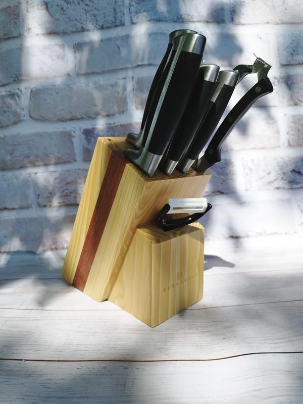 Набір ножів стане вигідним оновленням для вашої кухні. Він складається з п'яти ножів, мусату, овочечистки з кераміки, ножиць і підставки, призначених для різних випадків. У наборі практично всі ножі на всі випадки. Вироби розроблені з перевіреного та довговічного матеріалу — неіржавкої сталі. Ергономічна ручка забезпечує зручне захоплення. Ножі мають спеціальний кут заточування, особливу форму, що забезпечує зручність під час нарізування та оброблення продуктів. Особливості набору ножів Лезо заточене лазером Ергономічна ручка забезпечує зручне схоплення Характеристики набору ножів : Тип: з підставкою Матеріал лез: Нержавіюча сталь Матеріал овочечистки: кераміка Підставка: дерево Антибактеріальне покриття лез Кількість предметів у наборі: 9 шт Матеріал руків'я: Бакеліт Колір ручок: Чорний Колір лез: сталевий Комплектація: нож-секач ніж шеф-кухаря універсальний ніж ніж для чищення хлібний ніж мусат овощечитска ножиці підставка